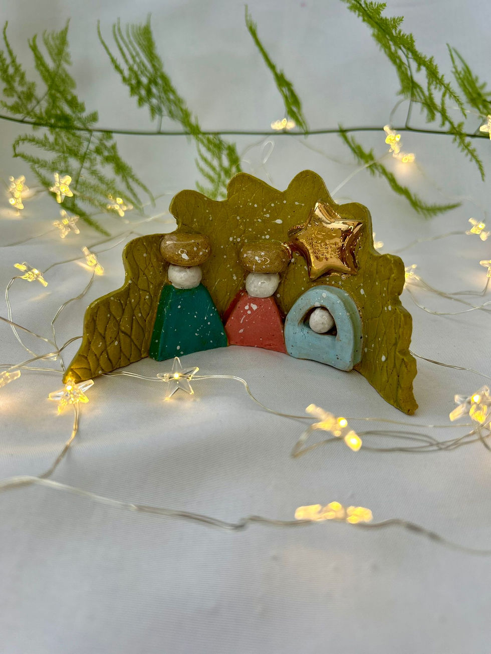 A collection of handcrafted pottery pieces with festive themes, including nativity scenes, gnome-themed pieces, colourful figures, and festive ornaments.